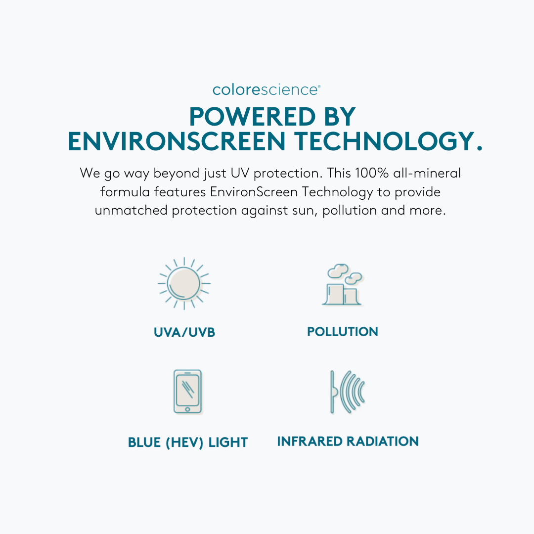EnviroScreen® Technology is proprietary to Colorescience. EnviroScreen® Technology uses patented active ingredients, Zinc Oxide and Titanium Dioxide, which create a barrier preventing free radical formation and oxidative stress. These patented actives are combined with specialty ingredients that, together, work synergistically to protect skin from damage caused by exposure to UVA/UVB rays, pollution, blue light (also known as High Energy Visible, or HEV, light), and infrared radiation.
