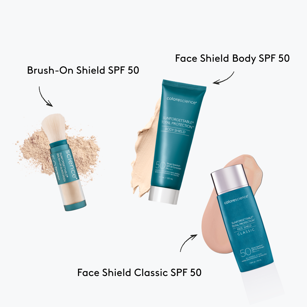 • Body Shield SPF 50: An antioxidant-rich, liquid mineral SPF 50 body sunscreen that provides full broad-spectrum UVA/UVB protection. Designed with EnviroScreen® Technology for invisible, 100% mineral protection from environmental aggressors.